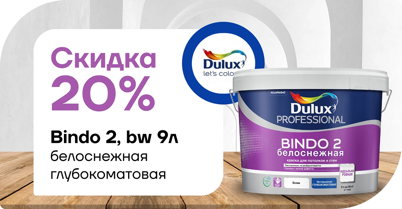 Скидка 20% на Dulux Professional Bindo 2 глубокоматовая белоснежная 9 л.