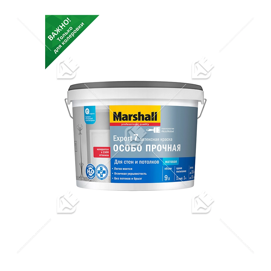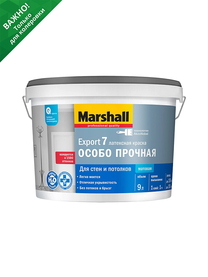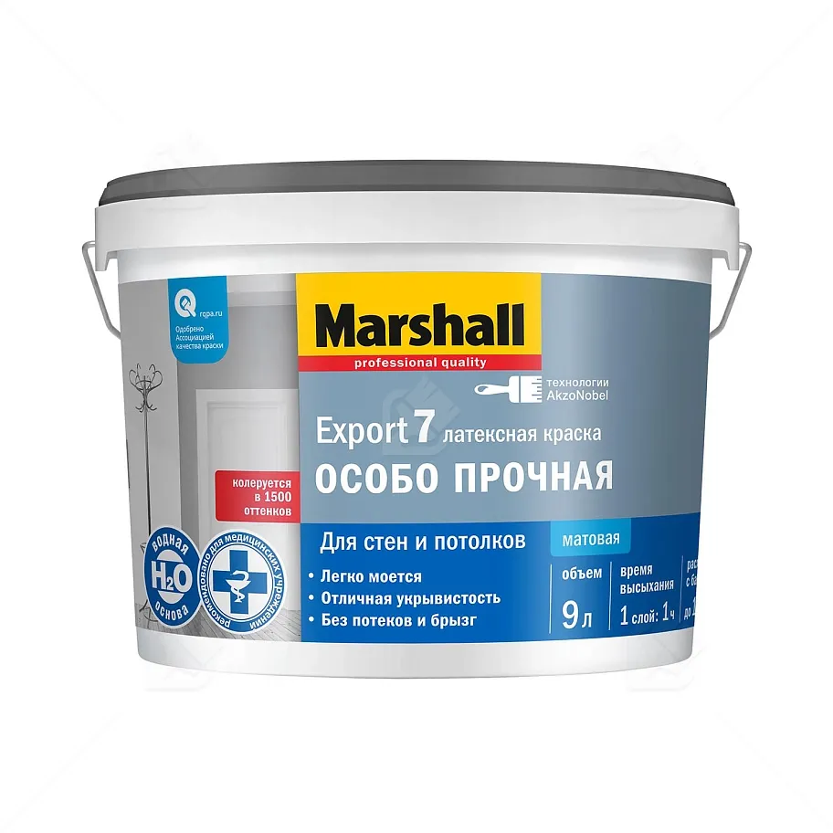 Купить профессиональную матовую латексную краску для стен и потолков Маршалл Экспорт-7, можно в нашем интернет-магазине по выгодной цене. При нанесении образует покрытие с высокими декоративными свойствами и отличной адгезией. Подчеркивает рельеф поверхности. Окрашенная поверхность выдерживает мытье с применением мягких моющих средств. Краска Marshall Export-7 легко наносится и быстро высыхает. Покрытие устойчиво к мытью с применением мягких моющих средств. Подчеркивает фактуру обоев, лепнины, штукатурки. Тиксотропная формула: без брызг и потеков. Обладает отличной укрывистостью.