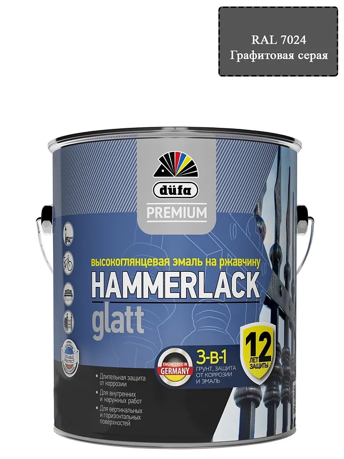 ПодробнееЭмаль на ржавчину Dufa Premium Hammerlack 3-в-1 гладкая RAL 7024 графитовая серая 2 л