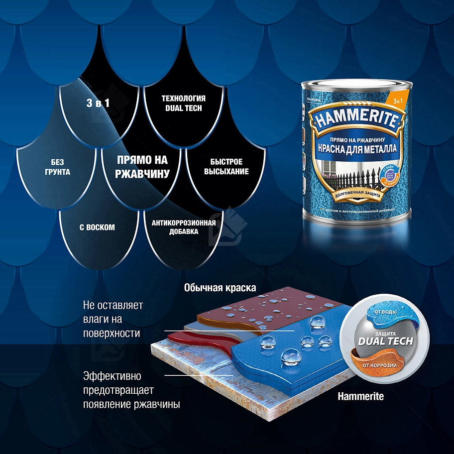 Купить краску по металлу Hammerite, алкидная молотковая краска Хаммерайт 3в1 для металлических поверхностей, идеально подходит для защиты металлических поверхностей от ржавчины. С формулой 3 в 1 (грунт, ингибитор коррозии, финишное покрытие), она легко и быстро придает красивый внешний вид и защищает металл. Благодаря технологии DUAL TECH с добавлением воска краска обеспечивает двойную защиту металлической поверхности от воды и коррозии.