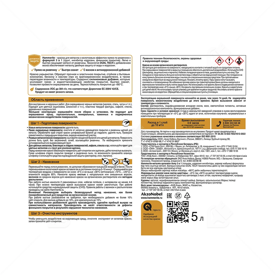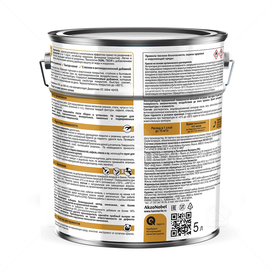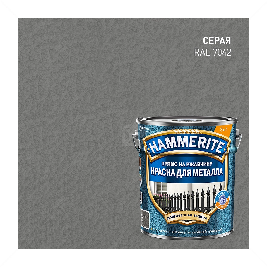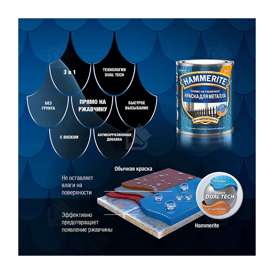 Купить краску по металлу Hammerite, алкидная молотковая краска Хаммерайт 3в1 для металлических поверхностей, идеально подходит для защиты металлических поверхностей от ржавчины. С формулой 3 в 1 (грунт, ингибитор коррозии, финишное покрытие), она легко и быстро придает красивый внешний вид и защищает металл. Благодаря технологии DUAL TECH с добавлением воска краска обеспечивает двойную защиту металлической поверхности от воды и коррозии.