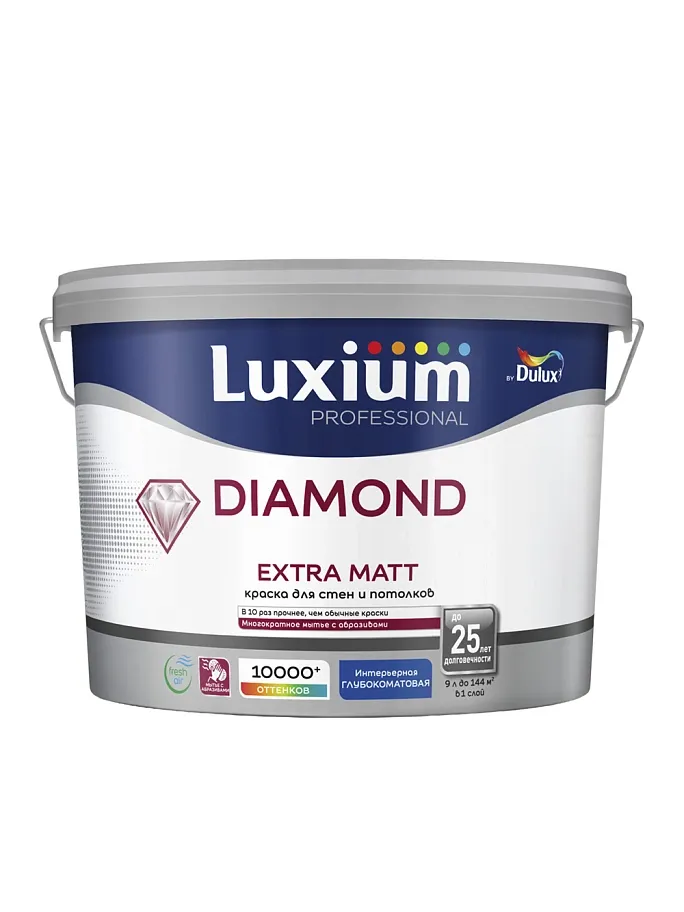 ПодробнееКраска для стен и потолков водно-дисперсионная Luxium Diamond Extra Matt глубокоматовая база BW 9 л