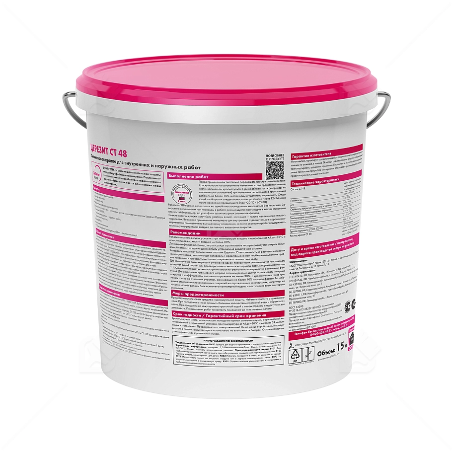 Силиконовая краска CT 48 поставляется в пластиковых ведрах по 15 л.