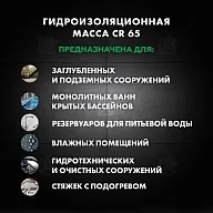 Гидроизоляционная смесь CR 65 предназначена для устройства водонепроницаемых покрытий на недеформирующихся незасоленных минеральных не содержащих гипс основаниях на полах и стенах внутри и снаружи зданий. Может применяться: