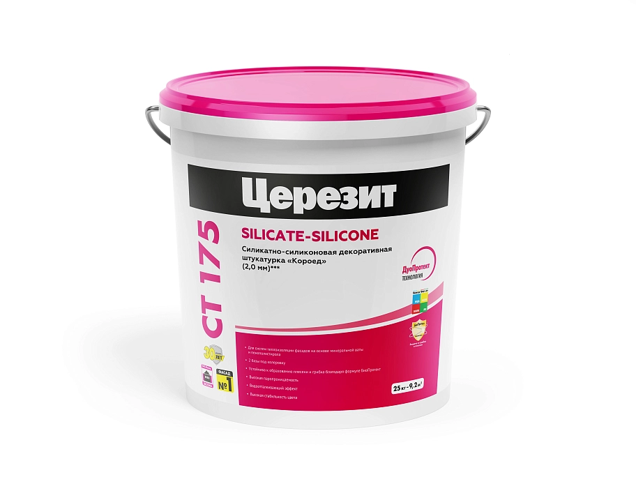 Декоративная штукатурка силикатно-силиконовая короед Церезит ЦТ 175 предназначена для изготовления тонкослойных декоративных покрытий с зернистой и бороздчатой фактурой на бетоне, цементных и гипсовых штукатурках, гипсокартоне, древесностружечных плитах и т.д. внутри и снаружи зданий. Рекомендованы для систем теплоизоляции фасадов с пенополистирольными (Церезит VWS) и минераловатными (Церезит WM) плитами. Соединяют в себе достоинства силикатных и силиконовых штукатурок и характеризуются высокой паропроницаемостью, стойкостью к загрязнению и грибкам, низким водопоглощением. Выпускаются в виде базы под колеровку и могут быть колерованы в соответствии с Церезит Color System, NCS, RAL и другими колеровочными системами. Эталонами цветов коллекции «Палитра Природы» для колеровки штукатурок являются цвета из альбома «Декоративные штукатурки, Издание 2017» том 1 и 2. Возможен подбор цвета по образцу заказчика. Купить фактурную штукатурку Церезит СТ 175 можно в нашем интернет-магазине в Москве, по лучшей цене.