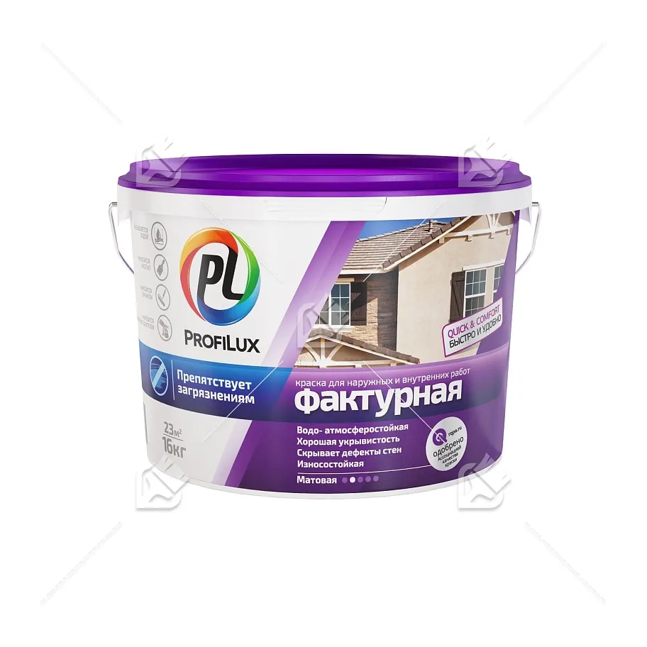 Краска фактурная фасадная для внутренних и наружных работ матовая Профилюкс ВД подходит для получения декоративного рельефного покрытия, для наружных и внутренних работ. Оптимальная фасадная краска по бетону - подходит для пеноблоков и газобетонных блоков. Хорошо наносится на бетонные, кирпичные, отштукатуренные и другие виды минеральных поверхностей. При использовании на лестницах и коридорах препятствует загрязнению. На фасадах затрудняет нанесение граффити фломастером и выцарапывание надписей. Купить краску Профилюкс ВД можно в нашем интернет-магазине, по выгодной цене.