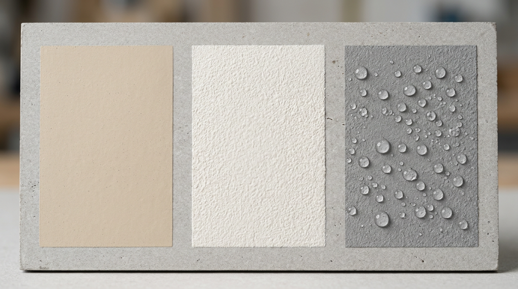 Адгезия ≥ 0,6 МПа — минимальный порог для минерального основания. Укрывистость напрямую влияет на бюджет: состав класса 1 перекрывает поверхность за один слой, класс 4 потребует трёх и более.