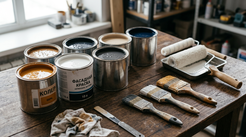 Краска фасадная для наружных работ выбирается по типу основания: для дерева — акриловая с паропроницаемостью Sd < 0,14 м, для штукатурки — силиконовая или акрилово-силиконовая. Всё остальное — нюансы бюджета, климата и состояния поверхности.